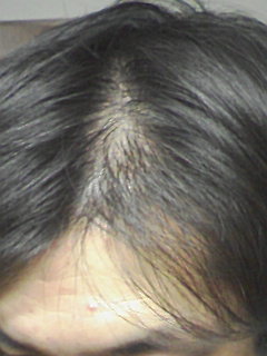 薄毛画像 薄毛になってくると左の画像のようになってきます。私の画像ですがこれでも回復してきている薄毛画像ですから、ひどかった時はもっと頭皮が見えていました。